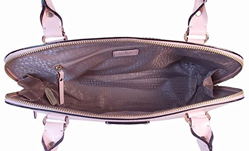 Wrapped in Hot Rose Pink textured leather with 14 karat light gold plated hardware. This structured and rigid satchel is lined in custom pink Kate Spade logo printed fabric and has an inner zippered pocket and two open slip pockets. It has a fully zippered top closure. The front is accented with Kate Spade nameplate and it has a flattened bottom panel. There are dual rolled leather handles that have a drop of about 4', or you can use the removable and adjustable shoulder and cross-body strap. The overall measurements are approximately 12' (L) at the bottom tapering to 10' (L) at the top x 9.5' (H) x 5' (W).Feature