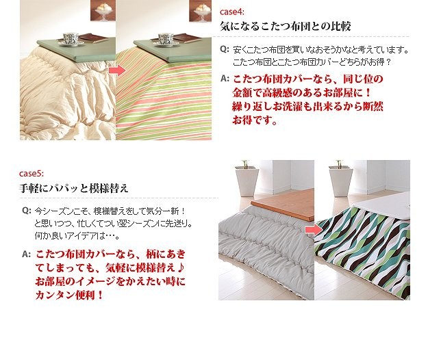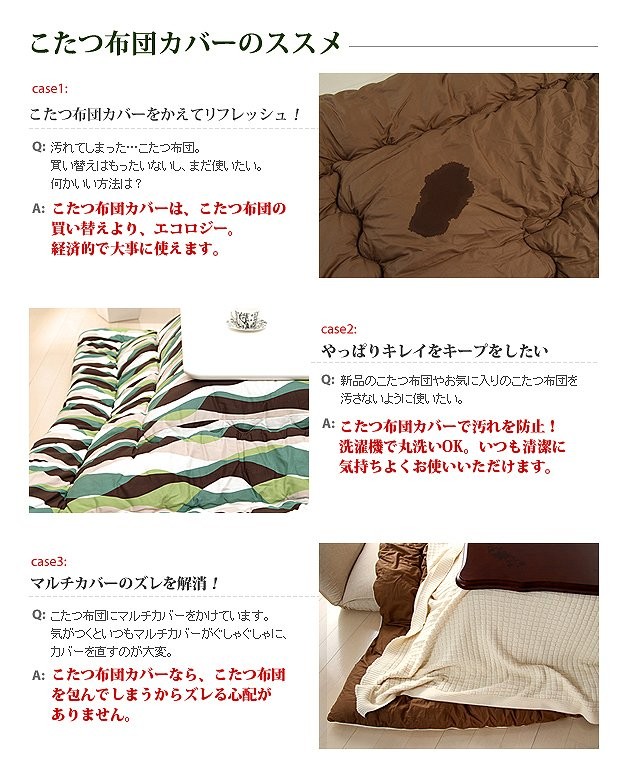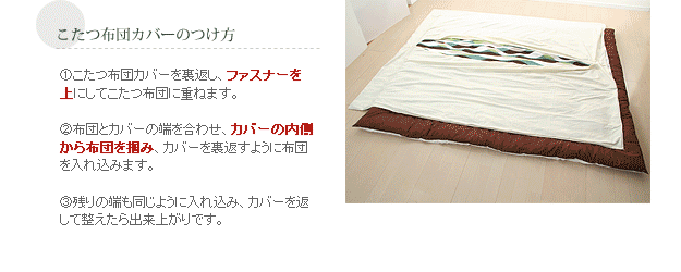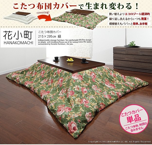 商品について:世代を超えて愛される花柄のこたつ布団カバー。優しいバラのモチーフと色合いが上品です。こたつ布団カバーをかえてリフレッシュ!こたつ布団の汚れ防止にもなります。洗濯機丸洗いOKで清潔にお使いいただけます。カバーの付け方も簡単♪ファスナーを中央よりにつけているので、布団の出し入れがスムーズに行えるのも魅力です。