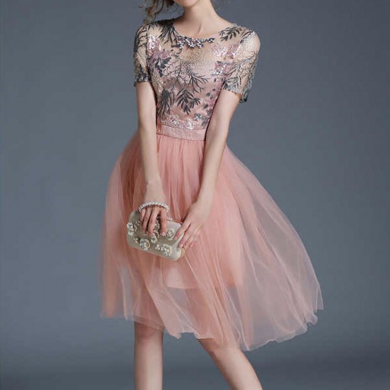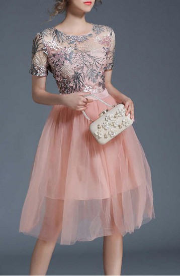 パーティードレス ひざ丈 ワンピース シフォン ピンク 刺繍 チュール ガーリー エレガント 可愛い 華やか 大人 お呼ばれ drgz2176