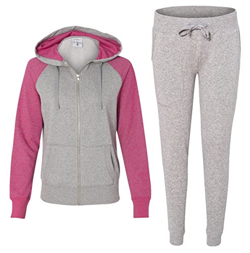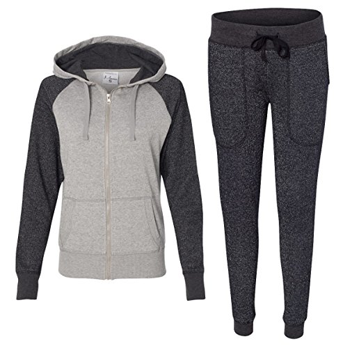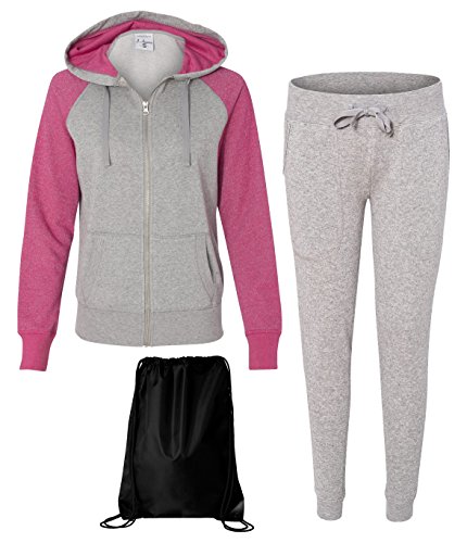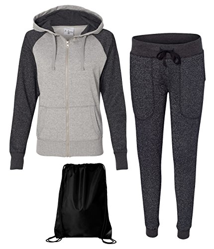 Binding : Apparel Product Description J. America's Glitter Sportswear Set keeps you comfortable, warm and on trend while going to and from practice or competition. This heavyweight 8 oz. is made of 55% cotton, 25% metallic, 20% polyester - the glitter is knit throughout the fabric. Contrast color sleeves and hood lining. 2 x 1 rib waistband and cuffs. Split kangaroo pockets on hoodie. Rounded side pockets and external drawcord on jogger pants. Sizing: S = 4-6, M = 8, L = 10, XL = 14, 2XL = 16. Waist (inches): S = 30, M = 32, L = 34, XL = 36, 2XL = 38. Body Width (inches): S = 38, M = 40, L = 43, XL = 45, 2XL = 47. Set comes with a Kamal Ohava nylon drawstring backpack (14" x 18"). 0