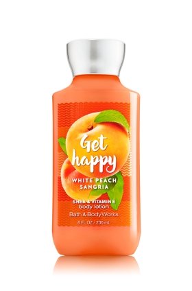-. Binding : Misc. -. Brand : Bath & Body Works -. EAN : 0667541523001 -. Feature : The body lotion provides 16 hours of continuous moisture. / Infused with Shea Butter and our exclusive daily moisture complex of protective Vitamin E, Aleo and conditioning Vitamin B5 with a non-greasy formula that absorbs quickly. -. IsAdultProduct : 0 -. Label : Bath & Body Works -. Manufacturer : Bath & Body Works -. MPN : B01J6E0TC4 -. PackageQuantity : 1 -. PartNumber : B01J6E0TC4 -. ProductGroup : Beauty -. ProductTypeName : BEAUTY -. Publisher : Bath & Body Works -. Size : 8 Ounces -. Studio : Bath & Body Works -. Title : GET HAPPY - WHITE PEACH SANGRIA Body Lotion 8 fl oz / 236 mL -. UPC : 667541523001