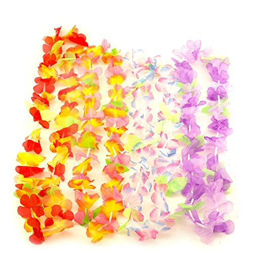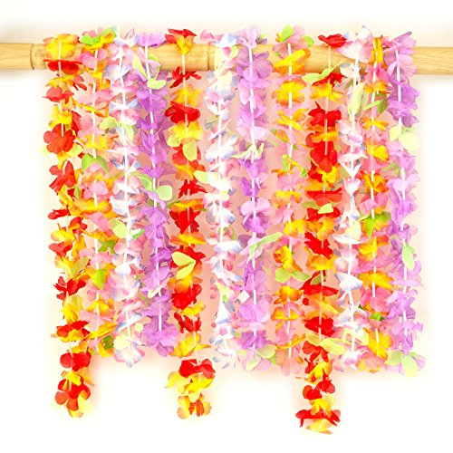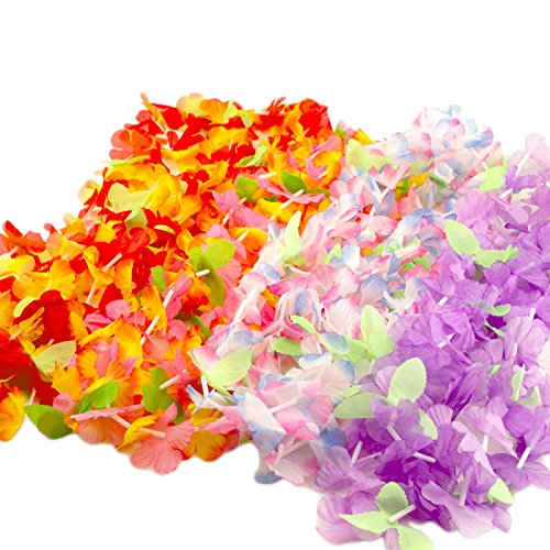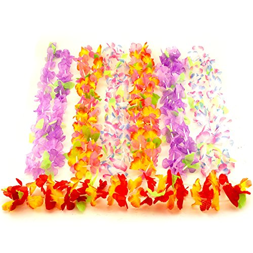 Adorox 48 pcs Hawaiian Ruffled Simulated Silk Flower Hula Party Leis Necklaces