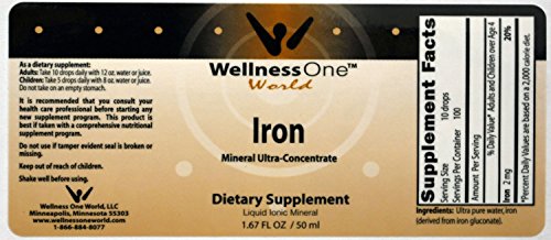 -. Binding : Health and Beauty -. Brand : WellnessOne -. EAN : 0051907044741 -. Feature : The Best Liquid Iron Supplement / Comes with a Dropper! Small size - Convenient for travel / Only 10 Drops equals 2mg of Ionic Iron - 100 Total Servings - Plus it absorbs better than pills. / Professional Grade - Natural Iron / Easy to Mix with Juice or Water. -. IsAdultProduct : 0 -. Label : WellnessOne -. LegalDisclaimer : The products and the claims made about specific products have not been evaluated by the United States Food and Drug Administration and are not intended to diagnose, treat, cure or prevent disease. The information provided is for informational purposes on -. Manufacturer : WellnessOne -. MPN : 1307 -. PackageQuantity : 1 -. PartNumber : 1307 -. ProductGroup : Health and Beauty -. ProductTypeName : HEALTH_PERSONAL_CARE -. Publisher : WellnessOne -. Studio : WellnessOne -. Title : Iron - Premium Liquid Mineral (100 days at 2 mg Per 10 Drop Serving) 50 ml bottle -. UPC : 051907044741