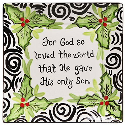 - Large square Christmas plate with hand painted holly design on the border and the biblical verse "For God so loved the world that He gave His only Son" written in the middle.