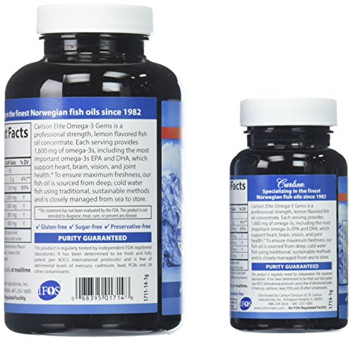 Carlson Elite Omega-3 Gems is a professional-strength, fresh fish oil concentrate. Just one serving contains 1,600 mg of omega-3s, including EPA and DHA which promote heart, brain, vision, and joint health. To ensure maximum freshness, we closely manage our omega-3 fish oil supplements from sea to store. We source the highest quality, deep, cold water fish using traditional, sustainable methods. The same day they're caught, our fish are transported to a highly-regulated Norwegian facility for processing and purification. The fresh fish oil is placed in soft gels, while the rest of the fish is used for human and animal consumption, so no part of the fish is wasted.Feature