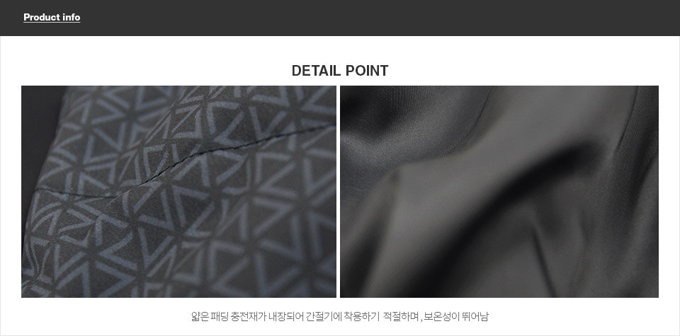- 얇은 패딩 충전재가 내장되어 간절기에 착용하기 적절하며, 보온성이 뛰어납니다.