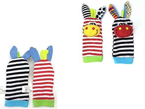 -. Binding : Baby Product -. Brand : new -. EAN : 0717261574507 -. Feature : This Garden Bug Foot Finder and Wrist Rattle Set develops muscles and hand-eye coordination by encouraging your baby to reach, grab and kick / Bug designs offer whimsical charm / Rattling sounds produced when babies kick helps develop hearing / Bright colors, patterns and smiling faces visually stimulate your little one / Multiple textures invite your child to touch and explore. -. IsAdultProduct : 0 -. Label : China -. Manufacturer : China -. PackageQuantity : 4 -. ProductGroup : Baby Product -. ProductTypeName : BABY_PRODUCT -. Publisher : China -. Studio : China -. Title : 4pcs set Cute Animal Infant Baby Kids Hand Wrist Bell Foot Sock Rattles Soft Toy -. UPC : 738651177535