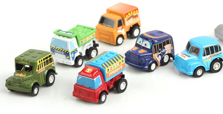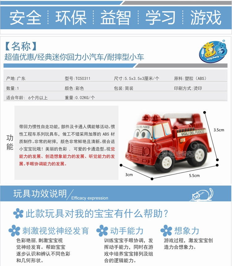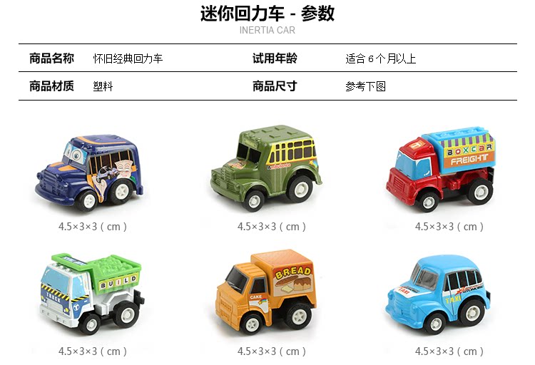 ③操作简单,把车车放在平面上,按住车车往后拖,松开手,车车就能向前跑了。别看他长得小,力气可不小,往后轻轻一拉,他就跑起来了,而且速度很快呢。