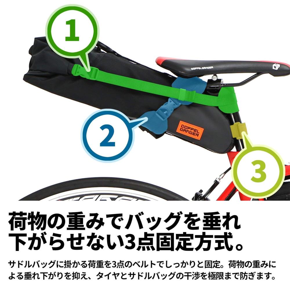 ・荷物の重みでバッグを垂れ下がらせない3点固定方式。