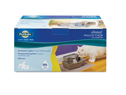-. Binding : Misc. -. Brand : PetSafe -. Department : Pet Supplies -. EAN : 0729849137080 -. Feature : 100 ounce water capacity is great for pets of all sizes / Free-falling stream entices pets to drink more water / Includes replaceable carbon water filter that removes bad tastes and odors, keeping water fresh / Elevated drinking dish for senior or arthritic pets / Low-voltage submersible pump for safe and quiet operation / BPA-Free and top-shelf dishwasher safe / Call, chat or email with our expert US-based customer care specialists six days a week; They are waiting to assist you and your pet with your product needs / PetSafe® brand has been an industry leading US manufacturer of pet behavior, containment and lifestyle products since 1991, helping millions of people and pets each year -. Label : Water & Feed -. Manufacturer : Water & Feed -. Model : PWW00-13708 -. MPN : PWW00-13708 -. NumberOfItems : 1 -. PackageQuantity : 1 -. PartNumber : PWW00-13708 -. ProductGroup : Pet Products -. ProductTypeName : PET_SUPPLIES -. Publisher : Water & Feed -. Studio : Water & Feed -. Title : PetSafe Drinkwell Multi-Tier Pet Fountain -. UPC : 729849137080