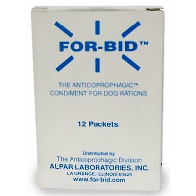 -. Binding : Misc. -. Brand : Forbid -. EAN : 0884982219946 -. Feature : For-Bid is a purified protein feed for animals that is intended to stop stool eating. When ingested, For-Bid travels through the gastrointestinal tract and imparts an unappetizing taste to stool. Upon tasting the stool, the animal will notice the unpleasantness and should discard it. As this association is reinforced, the stool eating should cease. / For-Bid is not an enzyme mixture and does not alter the normal digestive process of the animal. / For-Bid is made with high quality ingredients that have been shown to be generally recognized as safe by the the U.S. Food and Drug Administration. -. Label : For-Bid -. Manufacturer : For-Bid -. PackageQuantity : 1 -. ProductGroup : Pet Products -. ProductTypeName : PET_SUPPLIES -. Publisher : For-Bid -. Studio : For-Bid -. Title : For-Bid Coprophagia Stop poop eating for Dogs Puppys & Cats 12-Pack -. UPC : 884982219946