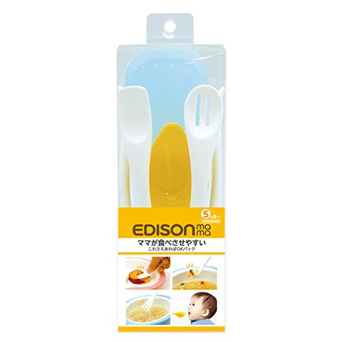 EDISON MAMA COMFORTABLE GRIP FORK AND SPOON SET (5 PCS) WITH A CASE (5 MONTH+) SPOON: BASIC, FEEDING, OPEN TYPE, MEDICINE / FORK: NOODLE FORK)
