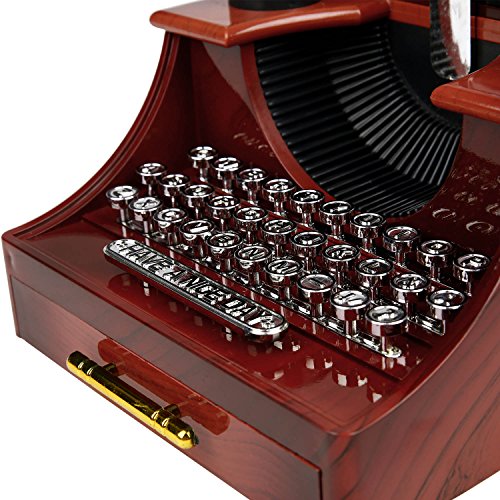 Feature : Creative typewriter music box, you twist the mainspring and pull up the drawer and then you will hear the wonderful music / At the same time, the typewriter will swing left and right until you close the drawer / Dimensions: length 18cm-7inch, width 14cm-5.5inch, height 10.2cm-4inch / Made of high gloss plastic.Color: Brown / How to use:rotating the switch,then open the drawer. With the operation of the machine, the wonderful music journey begin...