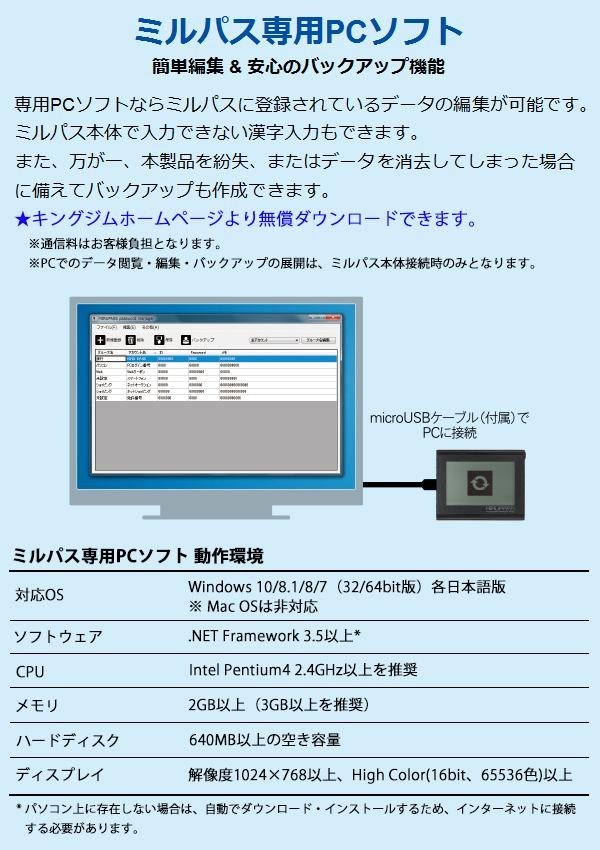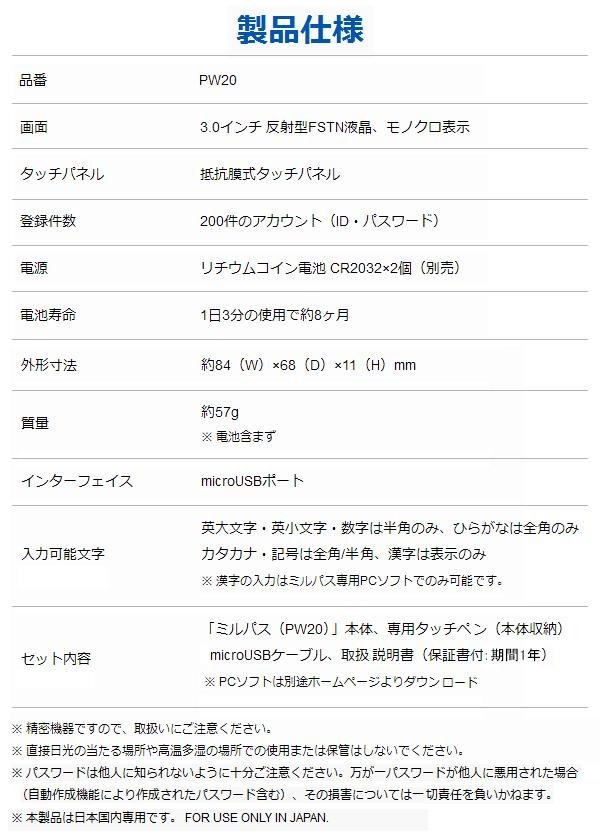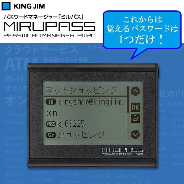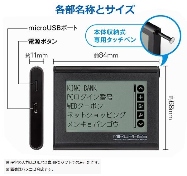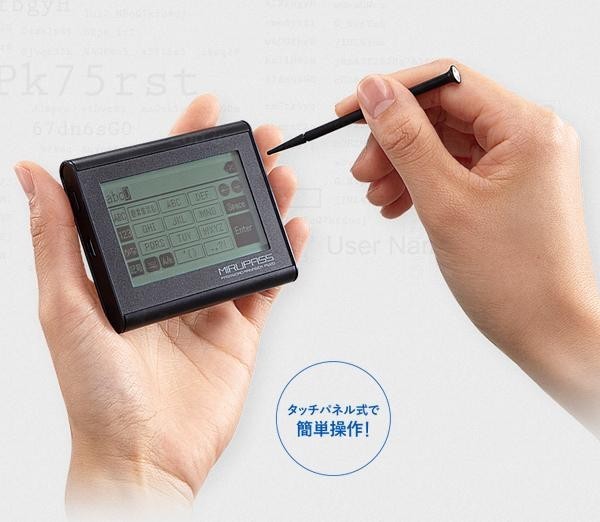 どんどん増えていくID・パスワードの管理に最適!!最大200件のIDとパスワードを、マスターパスワード1つで全て管理できます。タッチパネル式で操作簡単♪コンパクトなので持ち運びにも便利です。パスワード管理だけでなく、セキュリティの高いランダムなパスワードを自動で作成する機能が搭載されているので、新しいパスワードの設定にも便利です。 |