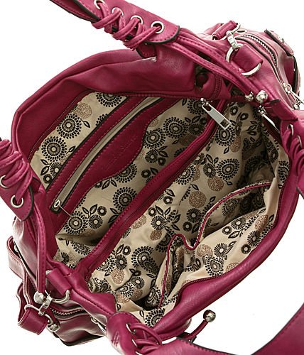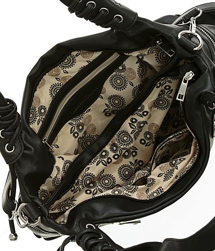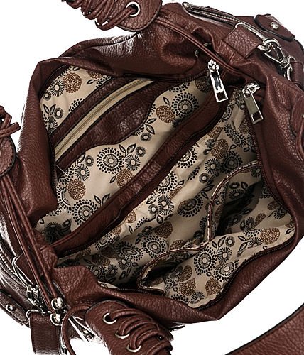 -. Feature : Top zipper closure - Measures approx. 10'' Height, 13'' Length, 4.5'' Width / Faux leather - Silver tone metal / 5 exterior pockets - Lining: polyester / Split compartment interior - 3 pockets inside / One of the pockets is sized to hold a cell phone - Strap: 9'' drop