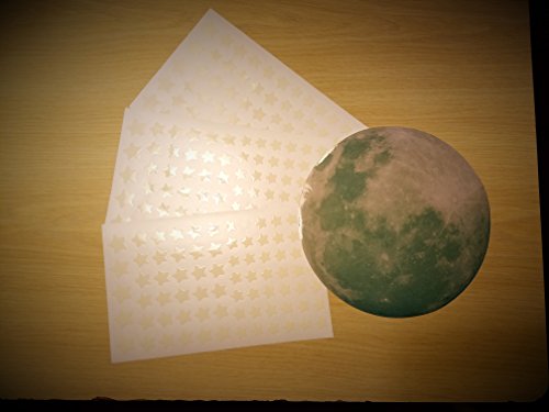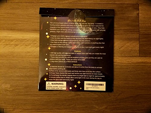 Package Includes (231 Stars and 1 Full Moon): ? 126 x 1.3cm stars ? 90 x 1.6cm stars ? 15 x 2.0cm stars ? 1 large 20 cm Glow in the Dark Full Moon (not partial or half) ? Highest quality and longest lasting glow 4 color premium printing for realistic moon effect and 0.1 mm thickness to provide you adhesive strength