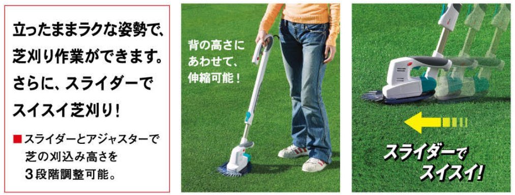 Three levels of cutting height of grass can be adjusted with slider and adjuster.