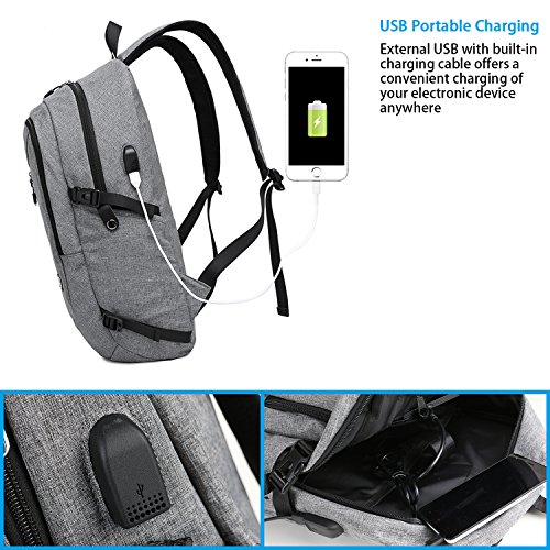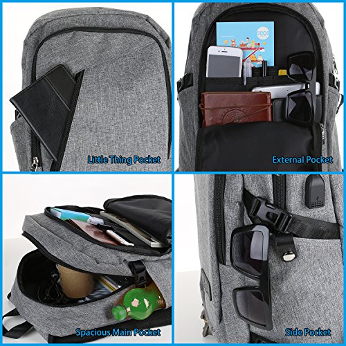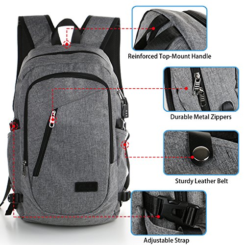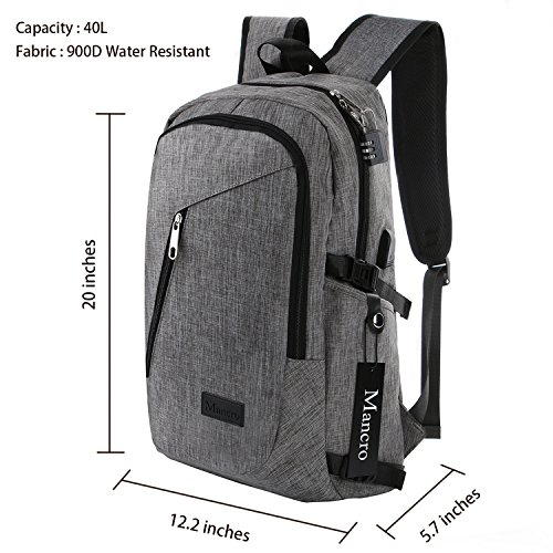 Mancro Business Water Resistant Polyester Laptop Backpack with USB Charging Port and Lock Fits Under 17-Inch Laptop and Notebook, Grey