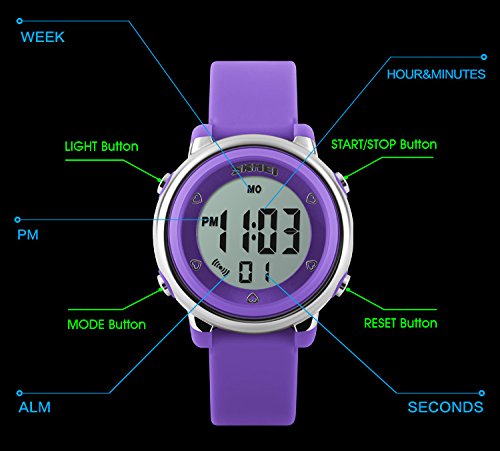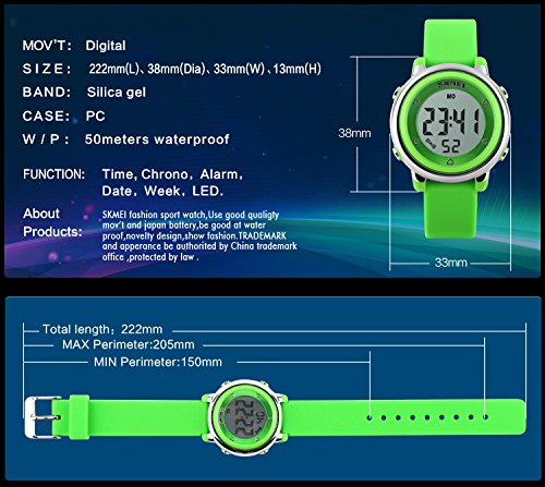 -. Feature : Child Kids Boy Girl Digital Sports Watches / Day & Date, Alarm, Stopwatch, 50m Water Resistant, Chronograph, Diver, Water Resistant, Backlight, LCD, LED, Easy To Read, 12-hour Dial, Calendar, Diver Watch, Waterproof, Shock-resistant, 24-hour Dial, Luminous, Light / Movement: Precise Digital quartz movement. / Water Resistant: 5ATM, 50M Water Resistant, Also for shower, swimming, Diving(Pls don't press any key under water)