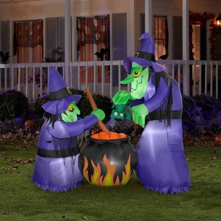-. Brand : Gemmy -. Feature : Stands 6 ft tall, 4.5 ft wide, and 3 ft deep. / Internally Lighted For Nighttime Display. / Comes With Heavy Duty Fan Motor, Yard Stakes & Tether Ropes. / Self Inflates!! Just Plug Into Any 110 AC Outlet. / Made By Gemmy. -. MPN : WMT-23422769-HAL -. PackageQuantity : 1 -. PartNumber : WMT-23422769-HAL -. ProductGroup : Lawn & Patio -. ProductTypeName : OUTDOOR_LIVING -. Title : Gemmy 6'H x 4'W Airblown Halloween Inflatable Double Bubble Witches with Cauldron