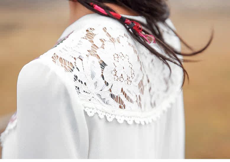 前片附在蕾丝上的花枝刺绣,花朵顺着藤蔓开出各种姿态,画面虚实相宜十分精致。  花枝刺绣