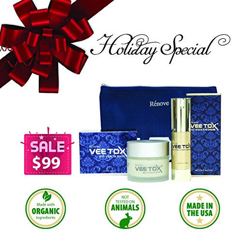 -. Feature : Holiday Season Special Bundle Package: Limited Quantity! Available at Amazon.com only...SALE...SALE....SALE Bundle Package, include Renove VEE TOX Cream, Renove VEE TOX Eye Cream, and Renove Cosmeic Bag - Renove VEE TOX Bee Venom Cream all natural ingredients, Paraben FREE / AN ANTI-AGING CREAM THAT WORKS - Renove Vee Tox Bee Venom Mask brings to you two of the best anti-aging ingredients, Bee Venom (purified) & Manuka Honey (Active 15+), that are completely organic & gentle - Say goodbye to cosmetic injections/fillers / FOR YOUTHFUL, WRINKLE-FREE SKIN - Pure Bee Venom in this face mask stimulates the production of elastin & collagen that work together to tauten your skin to remove all traces of wrinkles, loose skin & appearances of aging / THE VERY BEST MANUKA HONEY - Vee Tox uses the highest grade Manuka Honey (Active 15+) that's neither adulterated nor heat-treated - Manuka Honey (Active 15+) moisturizes, nourishes & smoothens your skin while removing topical impurities / VERSATILE ANTI-AGING EFFECTS - This anti-aging cream, with its simple enough application, provides a whole range of anti-aging effects that help you maintain naturally healthy, smooth & youthful skin free of those dreaded wrinkles