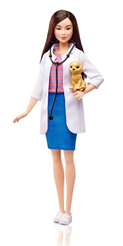 -. Feature : Dream big with Barbie career dolls / Young animal lovers will love exploring the world of animal care with Barbie pet vet doll / She is ready to care for pet patients in a white doctor's coat over a striped top, blue skirt and white shoes / Her long dark hair hangs in a trendy straight style / A modern black stethoscope is the perfect way to her adorable puppy patient's heart