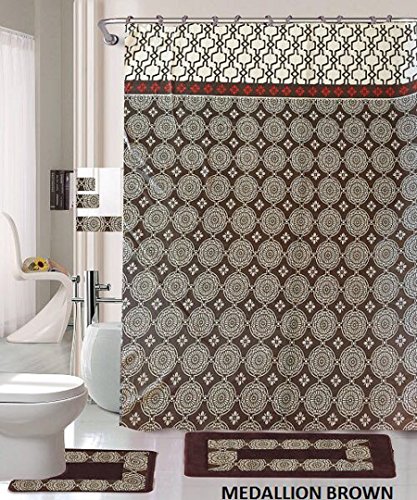 18 Piece Bath Rug Set Coffee Brown Silver Medallion print bathroom rugs shower curtain/rings and Towels sets-Medallion Brown