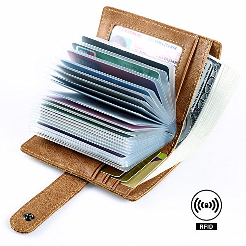 Features and benefits: * Premium, durablegenuine leather * Blocks RFID signal * Offers 23 card slots, 1 money pocket, 1 ID window * Vintage, Classic,and lightweight
