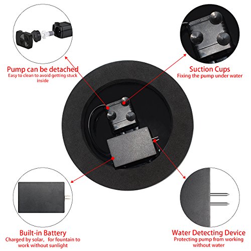 - 【Battery Backup】 It absorbs solar energy into its built-in battery when exposed to sunlight, so it can continue to work for 1 hour without sunlight unlike other solar fountains which stop working as soon as there is no sunlight.