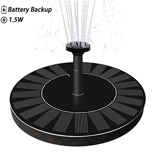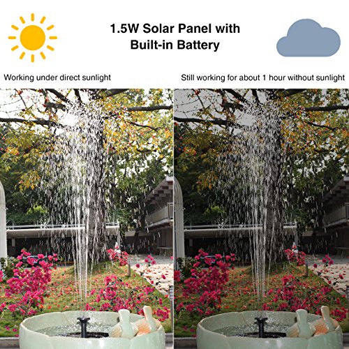 LATITOP Upgraded 1.5W Solar Fountain Water Pump with Battery Backup, Free Standing, Submersible, for Bird Bath, Garden, Back Yard and Small Pond.