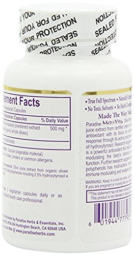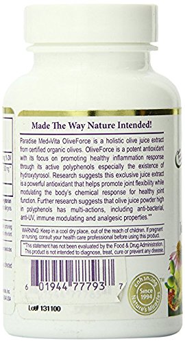 ReleaseDate : 2015-06-22 Studio : Paradise Herbs Publisher : Paradise Herbs Binding : Health and Beauty Product Description Paradise?med vita?oliveforce is a true full spectrum olive juice extract from certified organic olives. Oliveforce is a potent antioxidant with its focus on promoting healthy inflammation response through its active polyphenols especially the existence of hydroxtyrosol. Research suggests this exclusive juice extract is a powerful antioxidant that helps promote joint flexibility while modulating the body's chemical response for healthy joint function. Further research suggests that olive juice powder high in polyphenols has multi actions, including anti bacterial, anti uv, immune modulating and analgesic?properties. 0