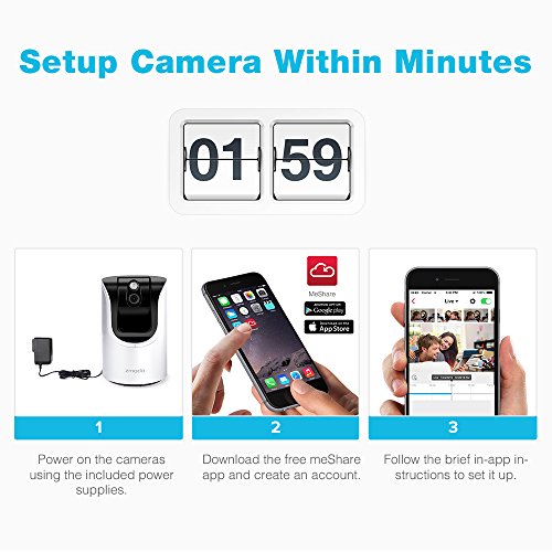 -. Binding : Electronics -. Brand : Zmodo -. EAN : 0889490008563 -. Feature : Easy Setup- Smartlink in Seconds!Power the camera, then input the WiFi password and it configures to complete the network connection. / Push Smart Alerts to Smartphone When Motion Detected-You can schedule notification by motion,sound and specific time. / Remote View Anywhere Anytime-Free meShare APP allows you to remote view , 350° pan and 85° tilt the camera.Two Way Audio directly to the ones you care.You can also view from PC (https://user.meshare.com/user/login) / 720p HD image quality with IR-cut--you can see more clear and detailed image with this high resolution camera day and night.Support microSD Card(Not Included) up to 64GB,so you can record and playback video within Lan. / Full 3-Year US Warranty and Lifetime Support Provided Directly from Zmodo and AFD Tech LLD on Amazon.Recommendations for the best experience with the camera:This camera is designed to work with the meShare app. Download the free app from the Apple App Store or the Google Play Store.Do not use Zsight with this camera.Make sure you connect to a 2.4GHz wireless network. This camera is NOT compatible with a 5GHz network. -. Label : Zmodo -. Manufacturer : Zmodo -. MPN : ZH-IZV15-WAC-AFD-N -. PackageQuantity : 1 -. PartNumber : ZH-IZV15-WAC-AFD-N -. ProductGroup : Photography -. ProductTypeName : SURVEILANCE_SYSTEMS -. Publisher : Zmodo -. Studio : Zmodo -. Title : Zmodo 1.0 Megapixel 1280 x 720 Pan & Tilt Smart Wireless IP Network Security Camera Easy Remote Access Two-way Audio -. UPC : 889490008563
