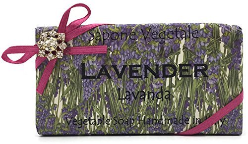 -. Feature : Alchimia Jeweled Lavender Vegetable Soap Handmade In Italy - 10.5 oz Soap Bar / 100% Vegetable Soap / Hand wrapped with decorative Tassotti paper, ribbon, and jeweled embellishment. / Taking a cue from the properties of plants and flowers and are sometimes integrated with chemical elements of neural origin such as vitamins, protein bases, vegetable oils. The colors tend to ivory some of our soaps, which originate from the natural color of used plant extracts. / Tassotti paper design may vary per soap bar.