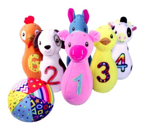 -. Feature : CUTE BABY BOWLING - Have fun with your little ones while they interact with the engaging Earlyears Baby Farm Friends Bowling set. This super cute toy set features bright colors, encourages hand-eye coordination, and is a chance for your little ones to learn the names of farm animals. All the pieces are soft, the pins make unique sounds, and the ball has its own chime for a complete experience. / 6 FARM ANIMAL PINS - The soft and hable pins each feature a favorite farm animal. There's a pig, duck, cow, donkey, cow, and chicken. Each pin features a unique sound. They also have flat bot, so they'll stand uP.R.Ight for bowling, and are numbered one to six in large contrasting fabric numbers. Line them up, knock them down, and pick them back up again! / HAVE FUN WHILE LEARNING - Fun as well as educational, this bowling set is ideal for helping little ones work on eye-hand coordination and gross motor skills as they aim to knock the pins. It's also an opportunity to learn about their farm friends and begin memorizing their numbers! / INTERNATIONAL PLAYTHINGS QUALITY - This product is part of the International Playthings LLC line of fun and interactive children's toys. Since 1967, we have excelled in the delivery of innovative and entertaining products with integrity, superior play value, and child developmental qualities in mind. / PRODUCT SPECIFICATIONS - Package includes (1) Earlyears Baby Farm Friends Bowling with 6 standing pins and 1 ball. For ages 12 months and up.