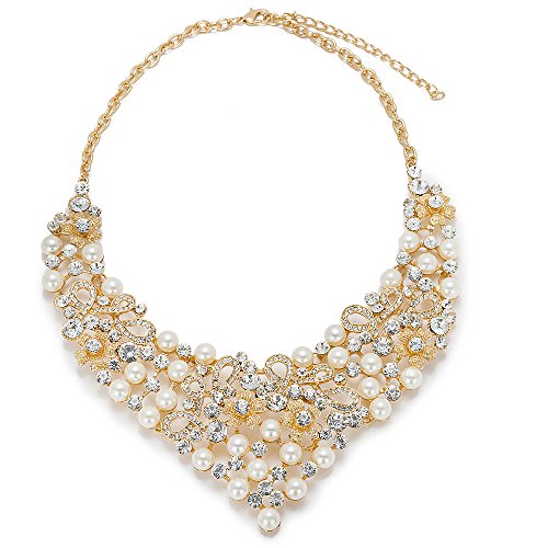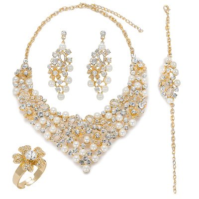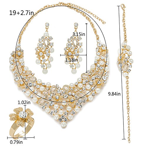 -. Feature : ITEM INFORMATION: 5 PCs Gold Plated Jewelry Set,Size: As Picture / PACKAGE INCLUDED: 1 necklace + 1 bangle + a pair of earrings +1 ring / DESIGN: The jewelry set is inlaid with luxurious pearls and zircon, and white zircon and ivory pearls contrast each other, the whole looks very noble,not only can modify the empty neck, but also add seasonal changes for the season dress, real catch eyes in a party.Take it will be different details of charm. / The surface of the jewelry is gold plated and the material is alloy. It will never fade and is not allergy for your skin. / This jewelry set is shinning, beautiful, luxury looking. It is suitable many occasions, such as dance, party, celebration and wedding. This set is an ideal gift for your girlfriend, fiancée, wife, mother or friend.