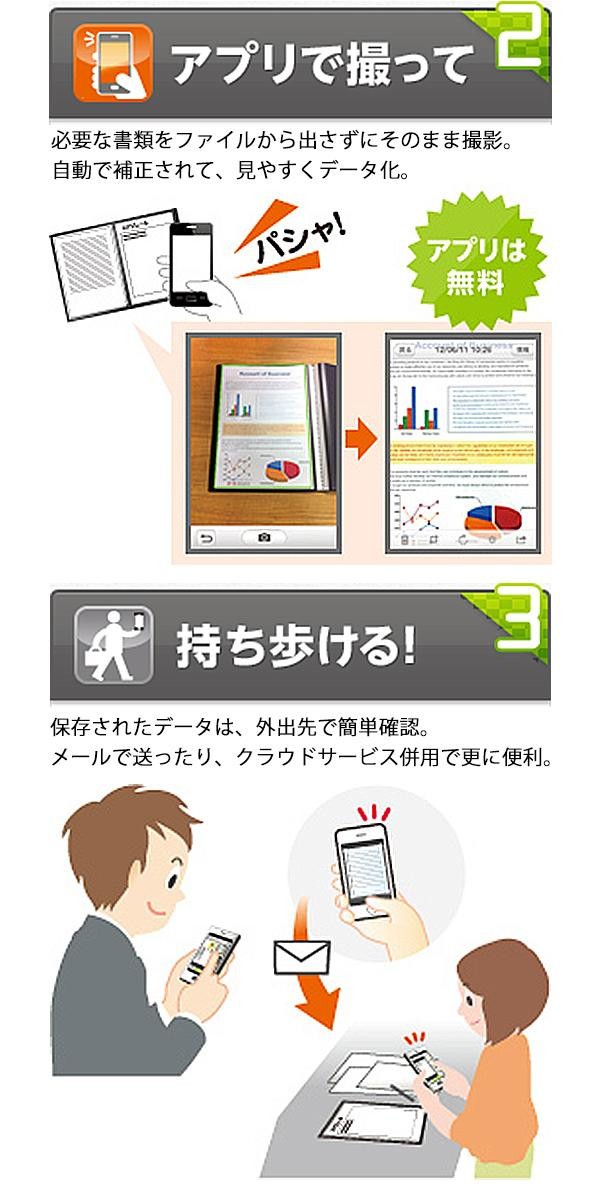 アプリでの撮影時に光りにくい低反射ポケットを採用しています。名刺のコントラストを強調する黒台紙なので、SHOT DOCSアプリを使った読み取りがスムーズ。スマートフォンで名刺を持ち出しできます。 |