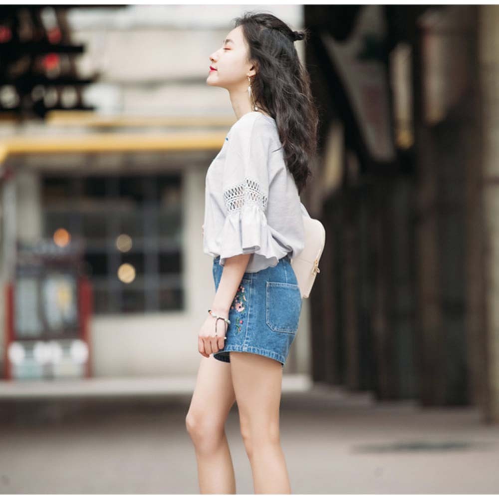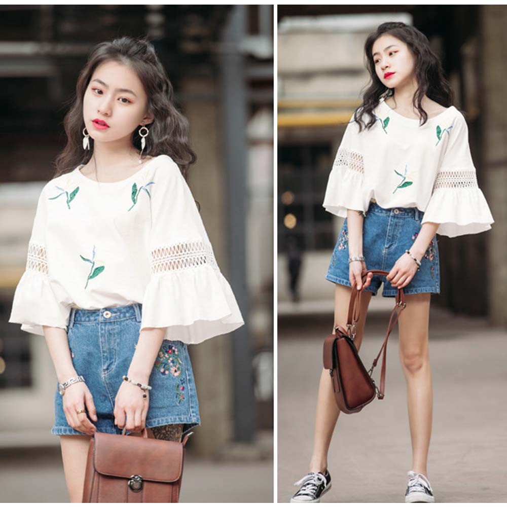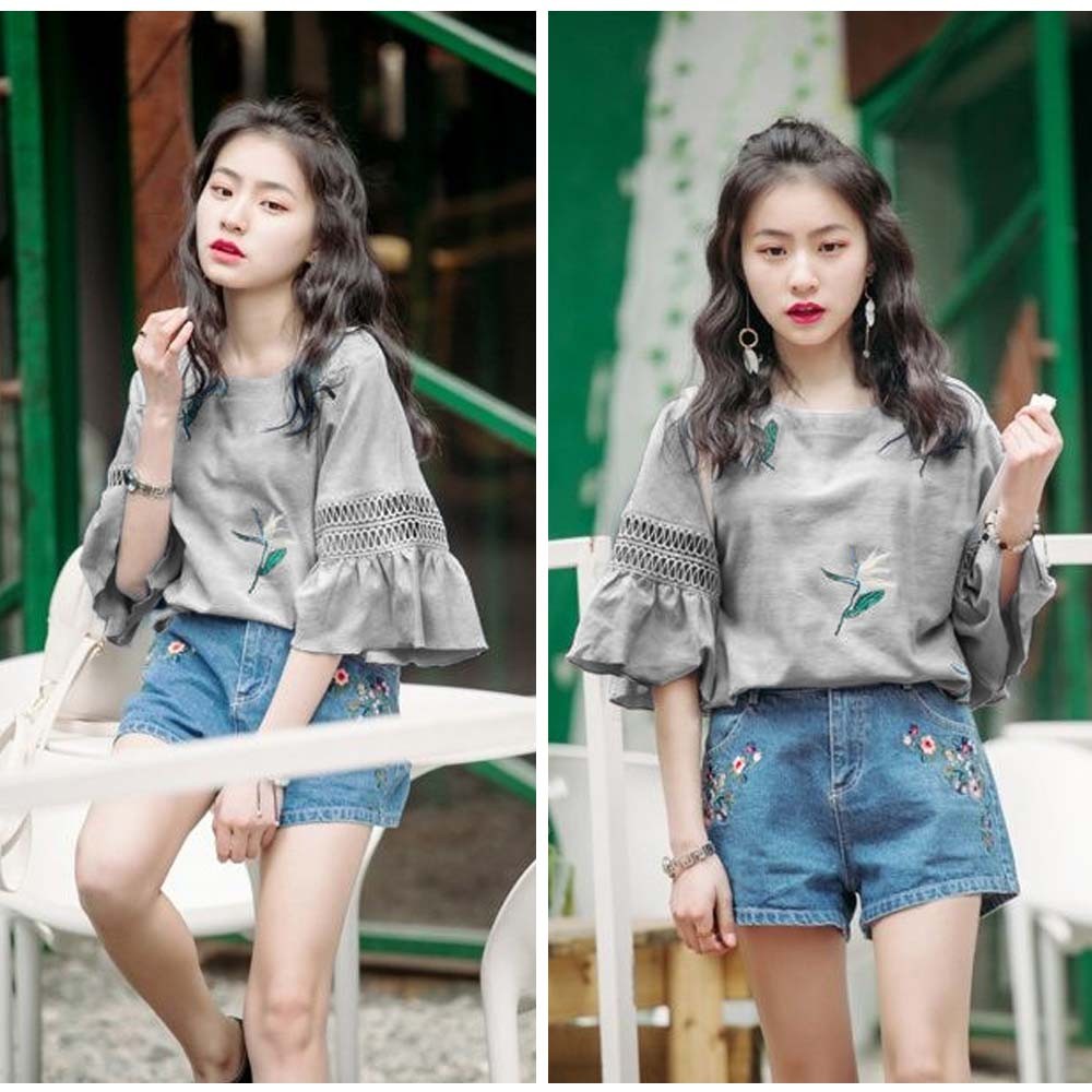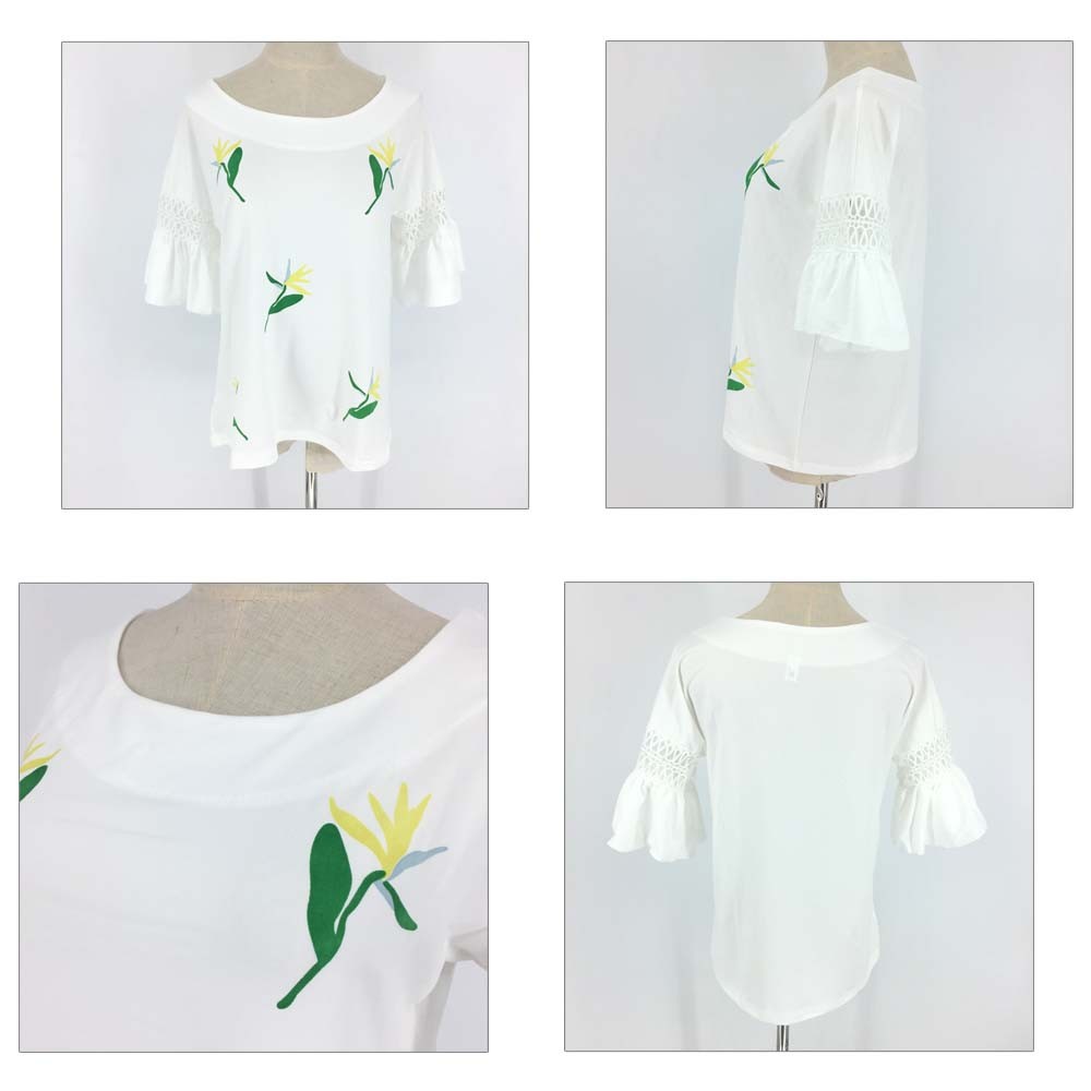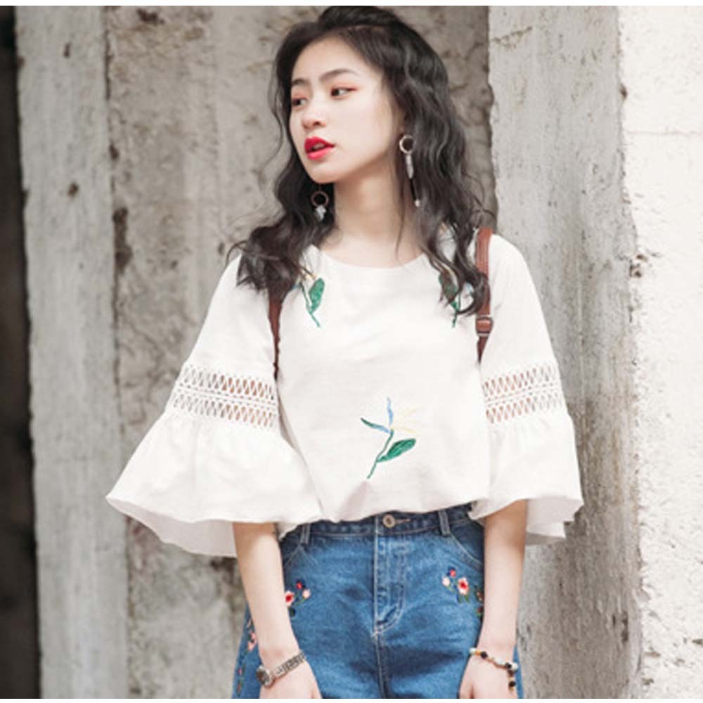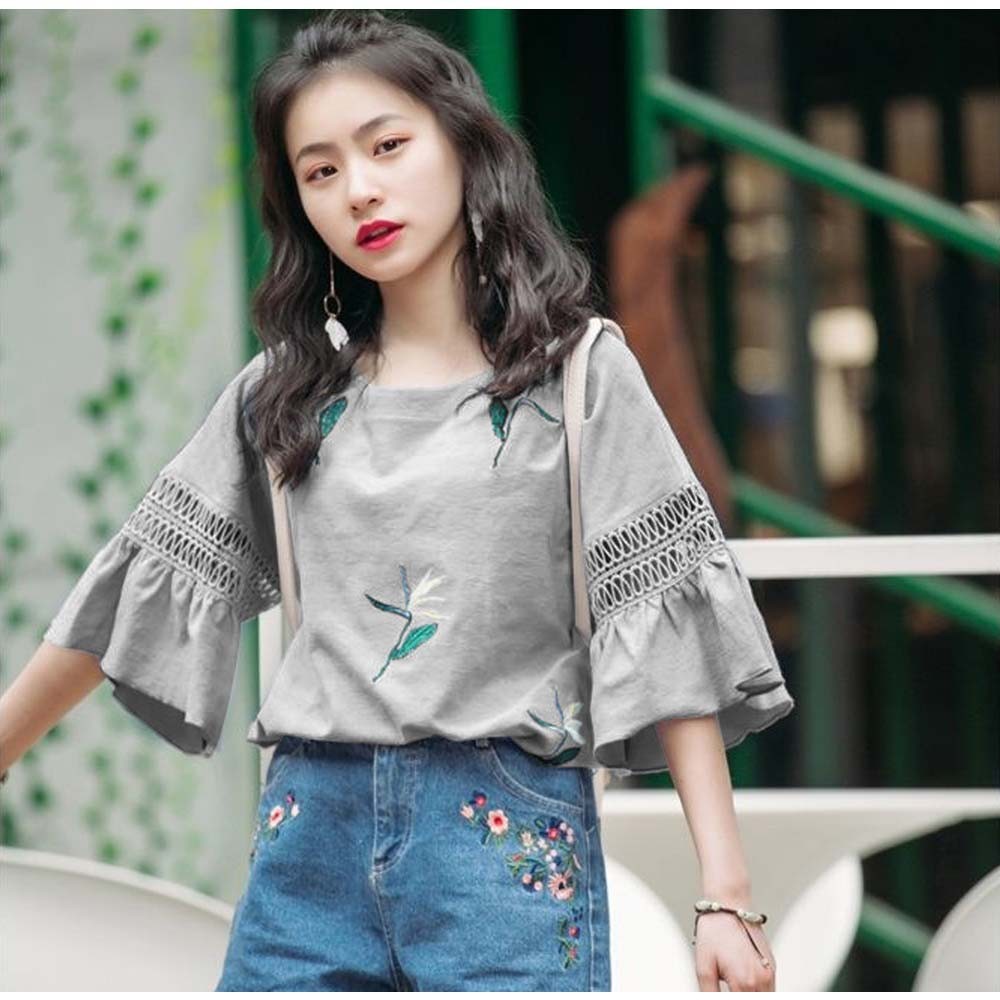 レースが施されたフレア袖がポイントのゆったりブラウス