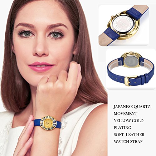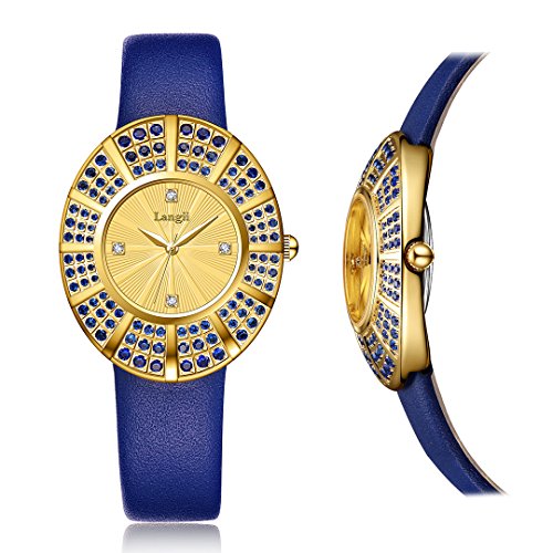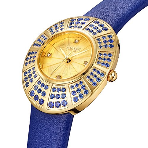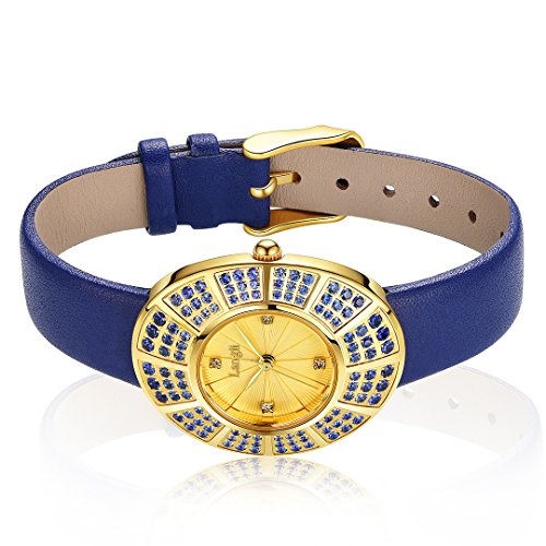 Langii Yellow Gold Plating Wrist Watch for Women Luxury Sapphire Blue Color Leather Yg1706sabl