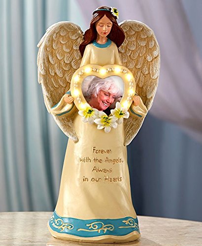 Studio : GetSet2Save Publisher : GetSet2Save Binding : Kitchen Product Description This Lighted Memorial Photo Angel is highly detailed and makes a beautiful gift or memorial. This figure holds a heart-shaped frame that illuminates with several LED lights. A touching sentiment is featured on her skirt. Holds a 2" sq. photo protected by acetate. On/off button. Requires 2 "AA" batteries. 5-1/4"W x 3-5/8"D x 9-3/4"H. Cold cast ceramic 0
