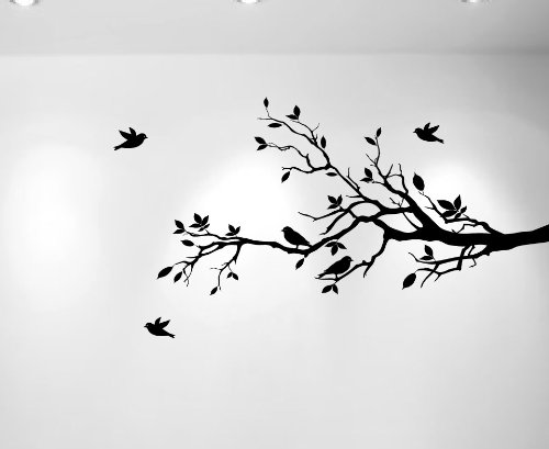 Tree Branches Wall Decal Love Birds Vinyl Sticker Nursery Leaves 56" Wide X 28" High (Right to Left, Matte Black)
