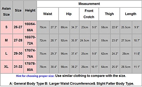 Size------------Waist------------Hip------------Front Crotch------------Thigh------------Length S------------27.3 inch-------34.3 inch-------------9 inch-------------22.6 inch---------9.9 inch M------------28.1 inch-------35.9 inch------------9.6 inch-------------23 inch----------10.7 inch L------------29.3 inch-------37.4 inch------------9.8 inch------------24.2 inch---------10.9 inch XL-----------30.4 inch-------38.2 inch------------10.1 inch------------25 inch----------11.1 inch 0