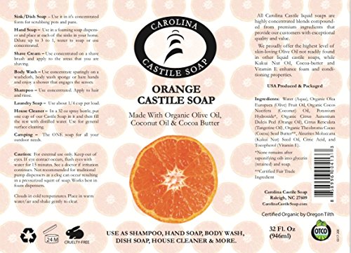 Certified Organic by Oregon Tilth. Made from Organic Olive Oil, Organic Coconut Oil, Kukui Nut Oil and Organic Cocoa Butter. Great for use as a body wash, shampoo, shaving soap, dish soap, house cleaning, and laundry soap. More skin loving Olive Oil content than any other major Castile Soap brand.