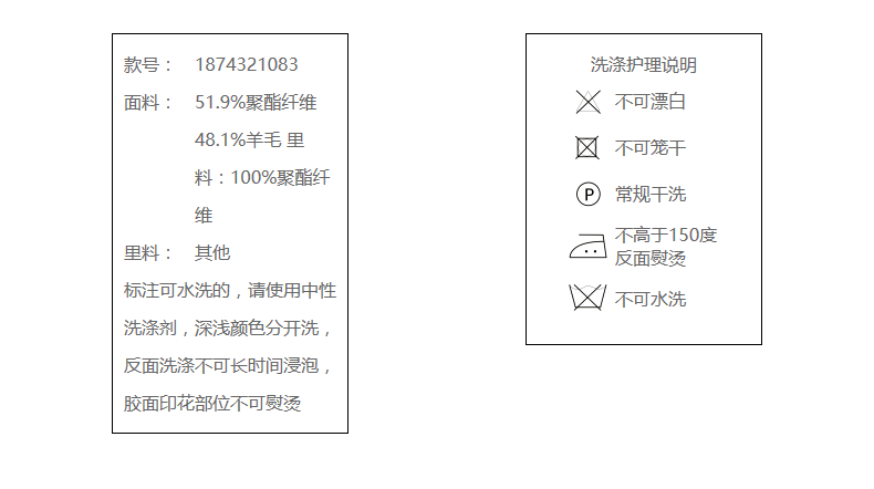 51.9%聚酯纤维 48.1%羊毛 里料:100%聚酯纤维