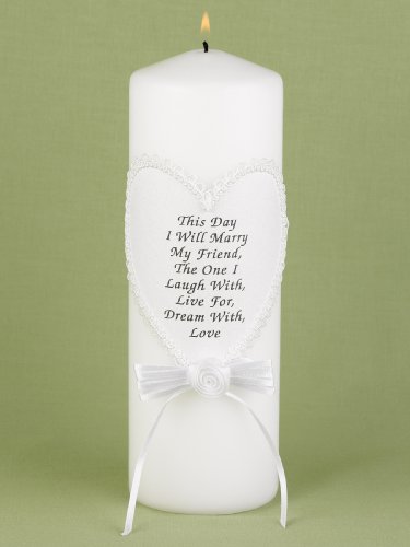 -. Feature : White unity candle decorated with a satin rosette and ribbon and contained in a heart the words This Day I Will Marry My Friend, The One I Laugh With, Live For, Dream With, Love / Pillar candle is 9-inches tall and 3-inches diameter / Set includes 2 white taper candles, each 10-inches tall / Charming candle works beautifully with many different colors and patterns / Hortense B. Hewitt has been a leader in top-quality wedding supplies for more than 60 years