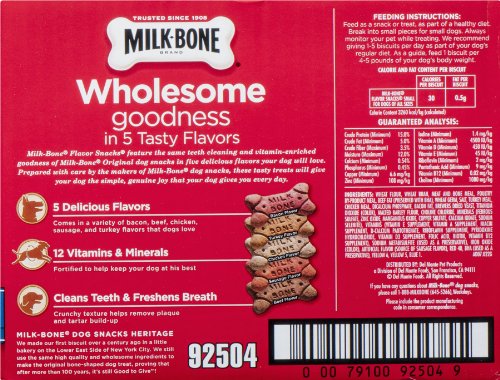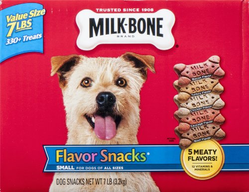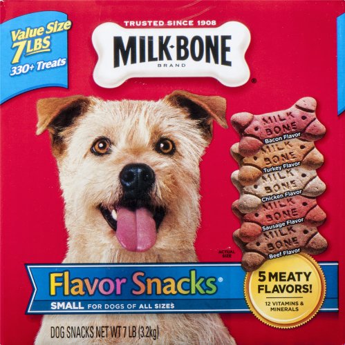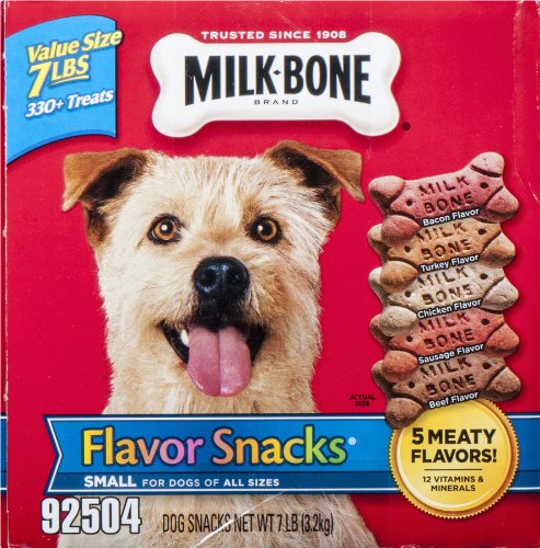 -. Binding : Misc. -. Brand : Milk-Bone -. EAN : 0079100925049 -. Feature : Milk-Bone® Flavor Snacks® Small Dogs Snacks. Trusted since 1908. For dogs of all sizes. 12 Vitamin & minerals. Value size 7 lbs. 330+ treats. 5 meaty flavors! Milk Bone bacon flavor. Milk Bone turkey flavor. Milk Bone chicken flavor. Milk Bone sausage flavor. Milk Bone beef flavor. -. IsAdultProduct : 0 -. Label : Del Monte Pet Products -. Manufacturer : Del Monte Pet Products -. PackageQuantity : 330 -. ProductGroup : Grocery -. ProductTypeName : GROCERY -. Publisher : Del Monte Pet Products -. Studio : Del Monte Pet Products -. Title : Milk-Bone Flavor Snacks Small Dog Snacks - 300 CT -. UPC : 079100925049