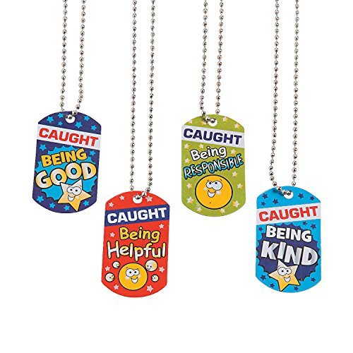 Features 12 "caught being good" dog tag necklaces. These are great for teacher's classrooms. Each 2" dog tag is on a 24" chain.