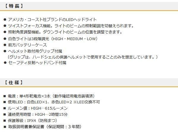 保護等級IPX4(防飛まつ)仕様の2色光源LEDヘッドライトです。白色ライトはHIGH・MEDIUM・LOWの3段階調光が可能です。