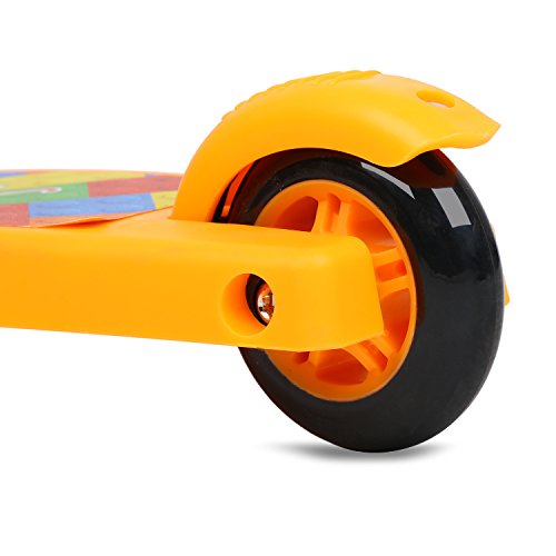 Feature : The mini scooter is also known as the "Mini Kick" - it is the quality choice in 3-wheel scooter for age 2-5. / Adjustable T-bar and safe lean-to-steer mechanism which easy and smooth turn right or left for kid and the hand grip very soft to protect kid's hand wouldn't hurt. / The wheel made of anti-abrasive and shock-absorbing Polyurethane with ABEC 5 chroms and light up as rolls around which creating attractive and smoothest glide. / The rear deck is reinforced by Super wide ABS for extra stability fit both feet and low-to-the-ground design which makes kids can more comfortable to enjoy the ride / Easy assembly,easy carrying,all parts are replaceable,35Kg(77lbs) weight capacity,With more efficient braking brakes in the entire rear wheel to ensure more safety.