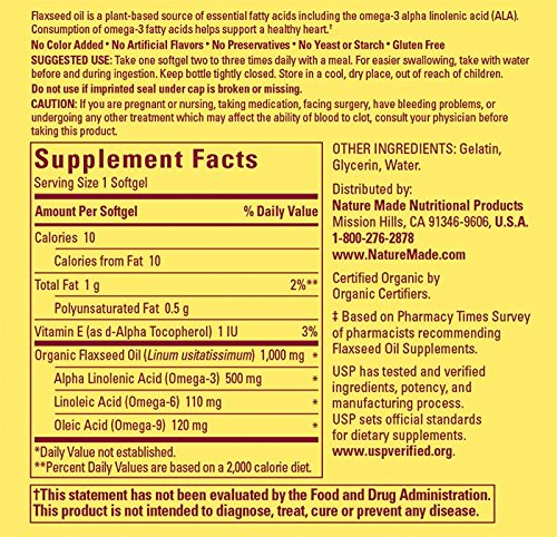 Trust your heart with Nature Made Flaxseed Oil 1000 mg. Flaxseed Oil is a plant-based source of essential fatty acids including the omega-3 alpha linolenic acid (ALA). Consumption of omega-3 fatty acids help support a healthy heart.†Feature